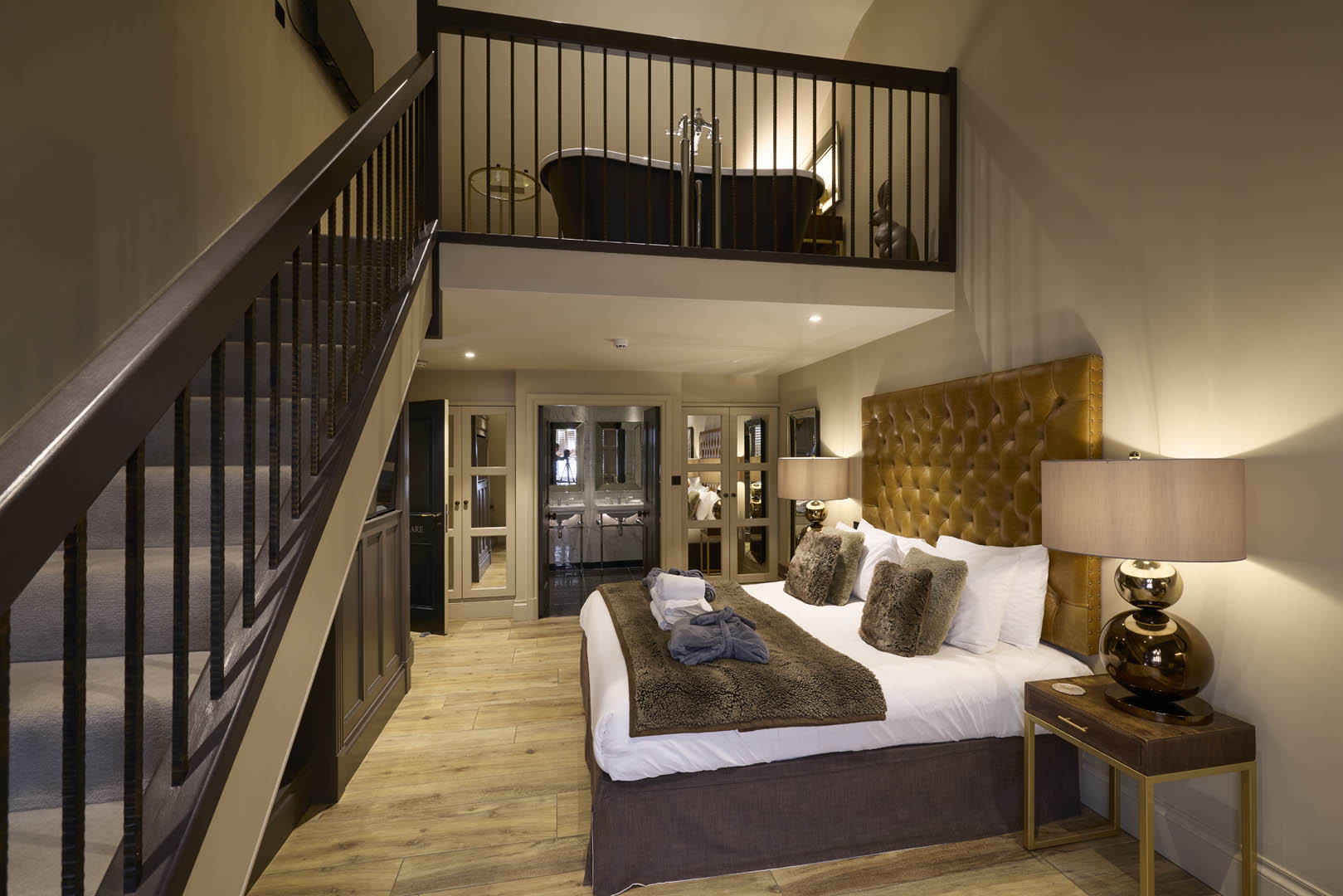 Mr Hare offers a blend of elegance and indulgence, perfect for a luxurious escape. This beautifully appointed room features a stunning mezzanine level with a roll-top bath and private dressing room, creating a truly unique and relaxing space.